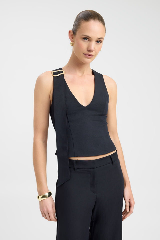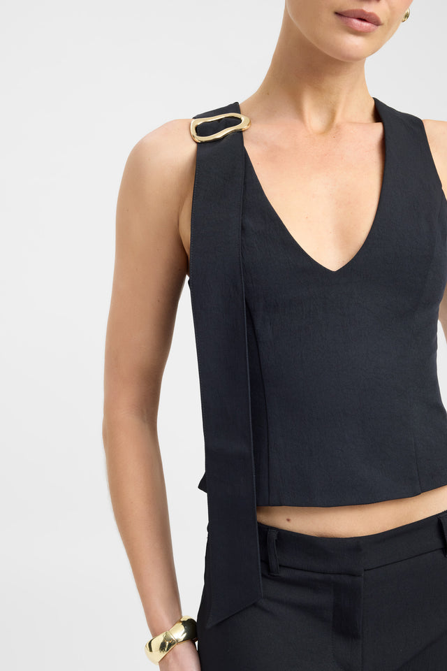 The Ariel Buckle Slider Top in Black is a structured statement. Crafted our much loved Ariel fabrication, this sophisticated piece features a subtle scoop neckline that frames the décolletage with refined simplicity. The gold organic buckle detail adds an artful element of interest.