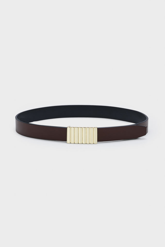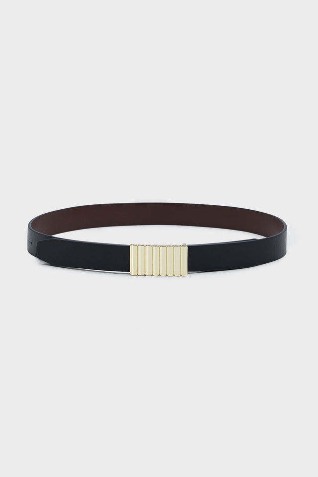 Elevate your capsule wardrobe with this classic belt. The Aston Belt features a reversable Black and Chocolate leather colourway and secures with a gold-toned flat buckle.