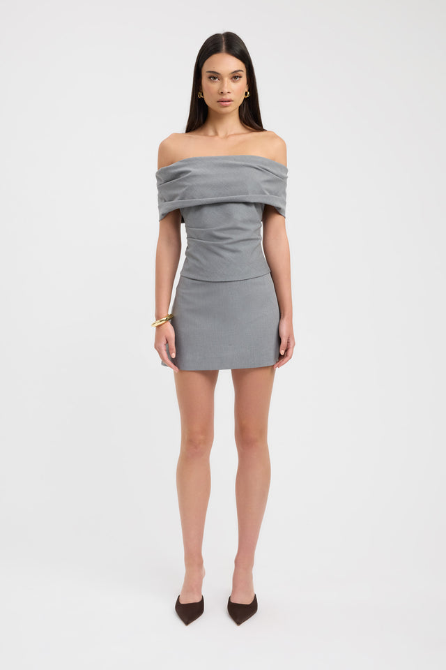 The Dallas Off Shoulder Top, crafted in a soft grey marle colourway, features a straight neckline and a structured rouched fold-over detail. This versatile piece combines contemporary style with a flattering off-shoulder design, making it a chic addition to any wardrobe.