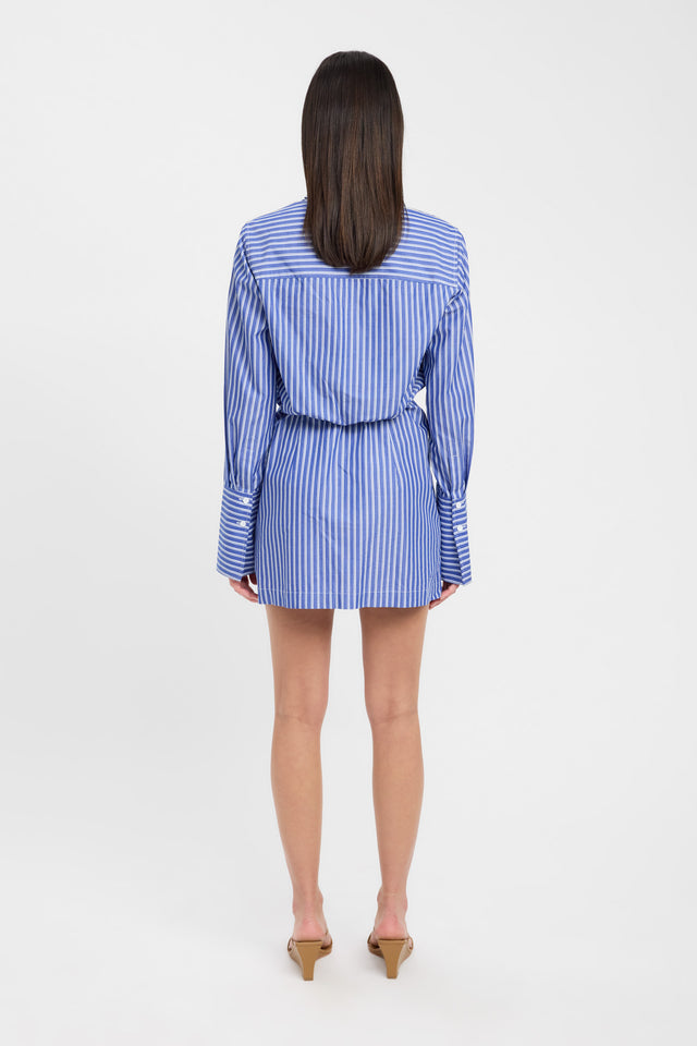 The Harvey Stripe Shirt Dress is a timeless and effortlessly chic piece. Crafted in a classic blue and white stripe, this versatile shirt dress features long sleeves and a mini length for a playful and modern feel.