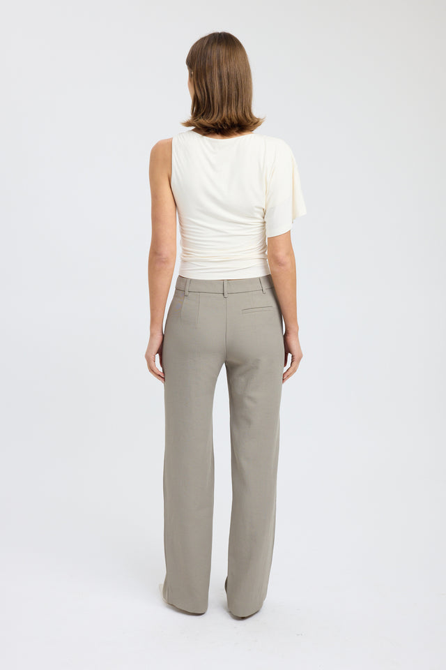 The London Top in Coconut Milk crafted from our soft rayon jersey fabrication, offering a refined silhouette with one-shoulder knot strap design accented by a subtle gold trim and a single fluid sleeve. The delicate ruching along the side enhances its elegant shape, making it a sophisticated choice for any occasion.
