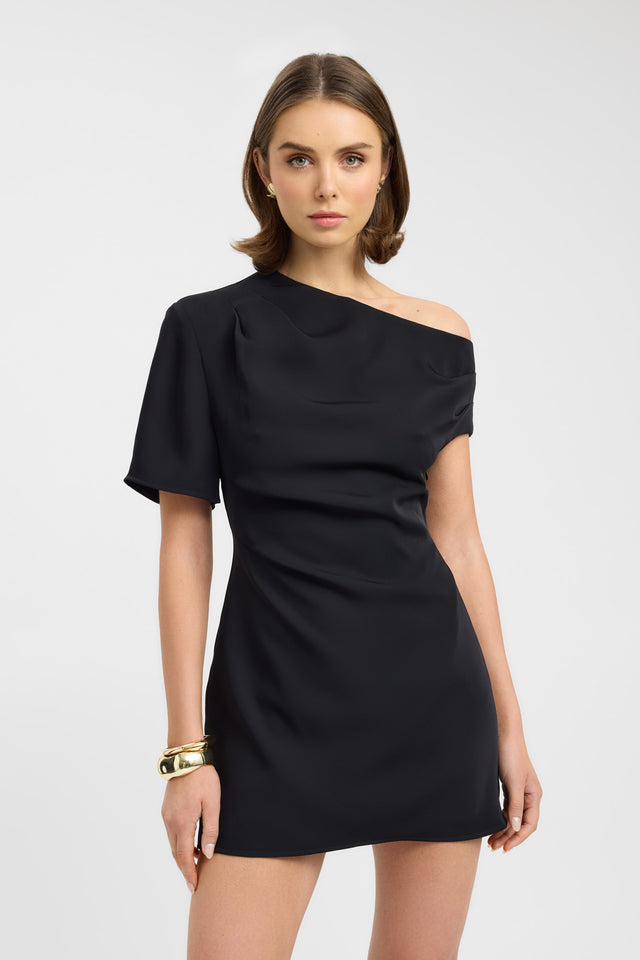 The Maria Asymmetric Mini Dress in black exemplifies refined design with its distinctive one-shoulder silhouette and elegant asymmetrical neckline and hemline. Crafted from our much-loved Maria fabrication, this sophisticated piece features artful ruching along the side, creating a flattering, contoured fit with a modern mini-length finish.