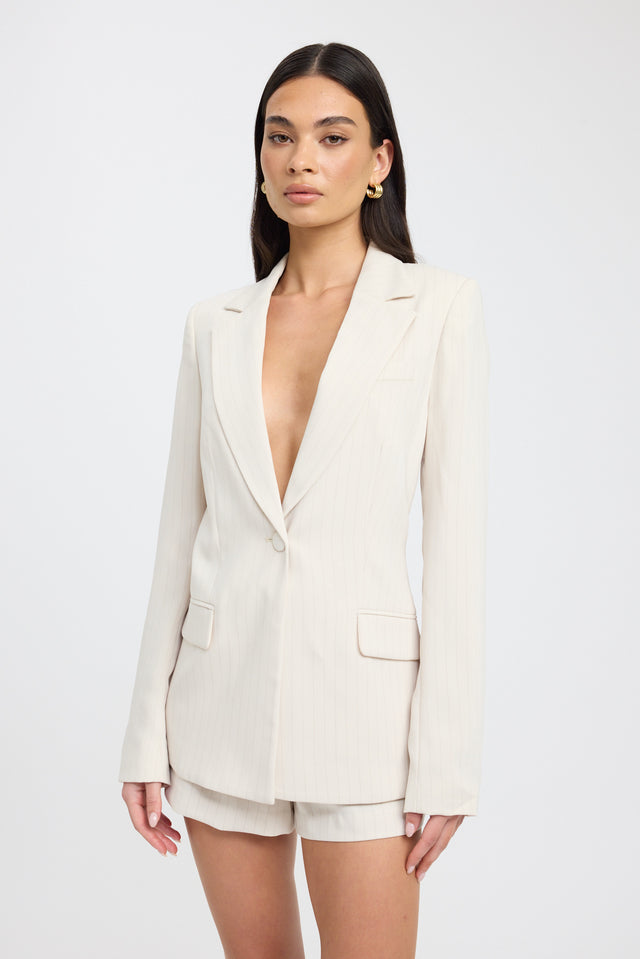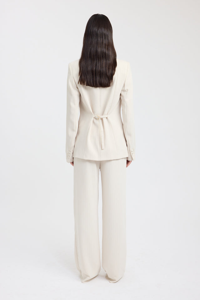 Elevate your wardrobe with the Oslo Cinched Blazer in the soft Almond Milk colourway, accented by a delicate chocolate stripe. Crafted from our Oslo fabrication, this flowy and comfortable fabric ensures ease of movement. Featuring a longline silhouette with a structured fit and a collared V-neckline, it can be cinched at the waist with a removable tie belt for a tailored finish.