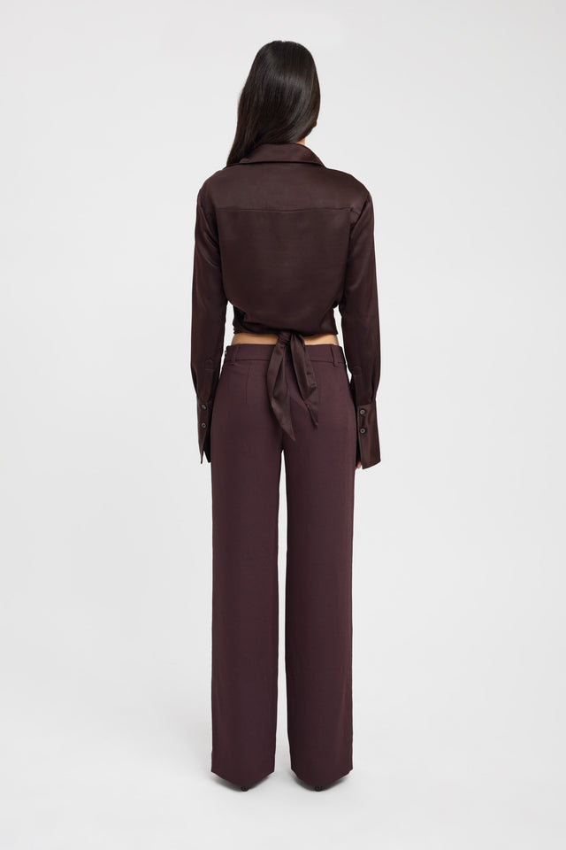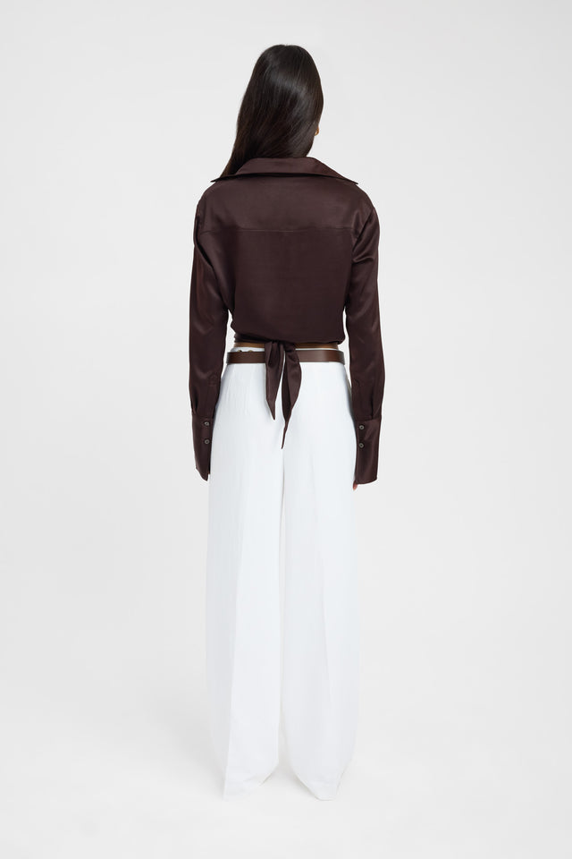 Introducing the Palermo Shirt in Mahogany, featuring a wrap detail that creates a cropped hemline and secures at the back for a softly cinched silhouette. Crafted from our signature Palermo fabrication, this elevated yet relaxed piece exudes effortless elegance.