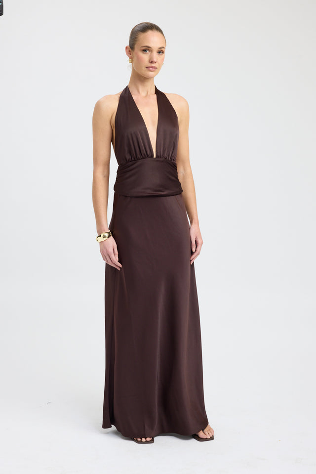 The Palermo Trim Top features a sleek halter neckline with a dramatic deep Vee, creating a striking silhouette. Gathered around the waist for a flattering fit, it is finished with an organic-shaped buckle trim at the back, which can be adjusted for personalised comfort and style. A perfect blend of elegance and contemporary design.