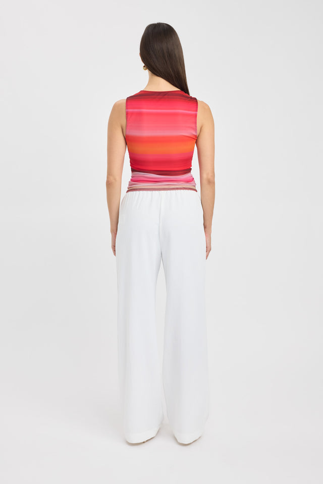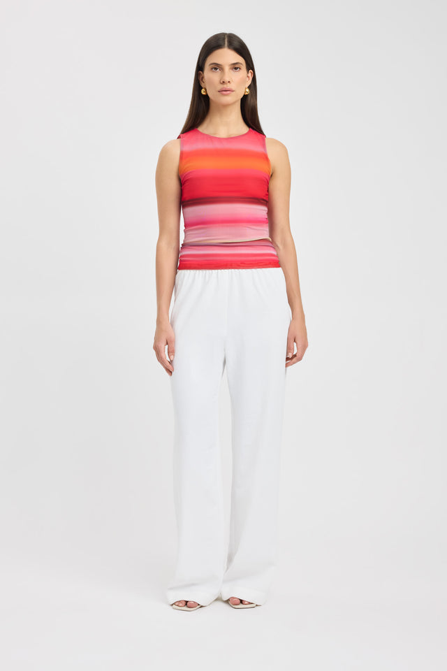 The Rae Tank is a sophisticated and stylish piece, adorned with a soft stripe prink with hues of pink, red, and yellow. The minimalist, sleeveless design and crew neckline provide a classic and versatile look. Pair it with tailored white pants to let the vibrant print make a statement.